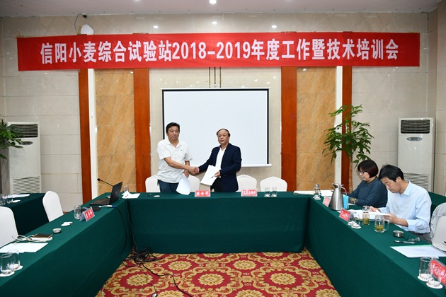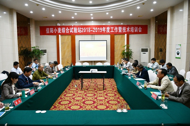 10月12日,信陽(yáng)小麥綜合試驗站2018-2019年度工作暨技術(shù)培訓會(huì )召開(kāi),羅山、息縣、潢川、淮濱、固始、光山等試驗站示范縣和國家貧困縣農業(yè)技術(shù)推廣依托單位分管領(lǐng)導、技術(shù)骨干、技術(shù)推廣人員40余人參加了會(huì )議。江蘇省農科院糧食作物研究所所長(cháng)、國家小麥產(chǎn)業(yè)技術(shù)體系沿江綜合試驗站站長(cháng)馬鴻翔研究員,河南省農業(yè)廳植保植檢站病蟲(chóng)防治科科長(cháng)、河南省小麥產(chǎn)業(yè)技術(shù)體系植保崗位專(zhuān)家于思勤研究員應邀參會(huì )。我院副院長(cháng)祁玉良研究員參加會(huì )議并講話(huà),院小麥研究所副所長(cháng)周?chē)诟毖芯繂T主持了會(huì )議。